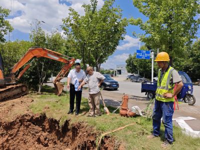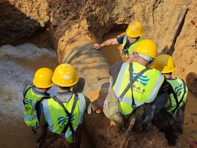 不懼“烤”驗,隨時出擊。7月5日,永安大道DN600主管道突發(fā)爆管,咸寧思源水務(wù)接到報修電話,立即組織人員趕赴現(xiàn)場,爭分奪秒開展管網(wǎng)搶修作業(yè)。搶修人員第一時間設(shè)置安全警示標(biāo)識,在確定好漏點(diǎn)位置、做好現(xiàn)場保護(hù)、關(guān)閥停水后,頂著36℃高溫,有條不紊展開搶修工作。經(jīng)過抽水、挖掘、清理,管道破損位置露出水面。在狹長窄小的管溝中作業(yè),轉(zhuǎn)身接零部件都得小心翼翼,搶修人員身上的衣服濕了干、干了濕,似火的烈日曬得他們皮膚滾燙,藿香正氣水的刺鼻味道充斥在他們的胸腔,有人笑稱:“藿香正氣水都喝飽了。”哪怕在這樣的工作環(huán)境下,他們也沒有一個人抱怨,沒有一個人偷懶,用八多個小時的堅守?fù)Q來了居民在炎炎夏日里的用水安全。