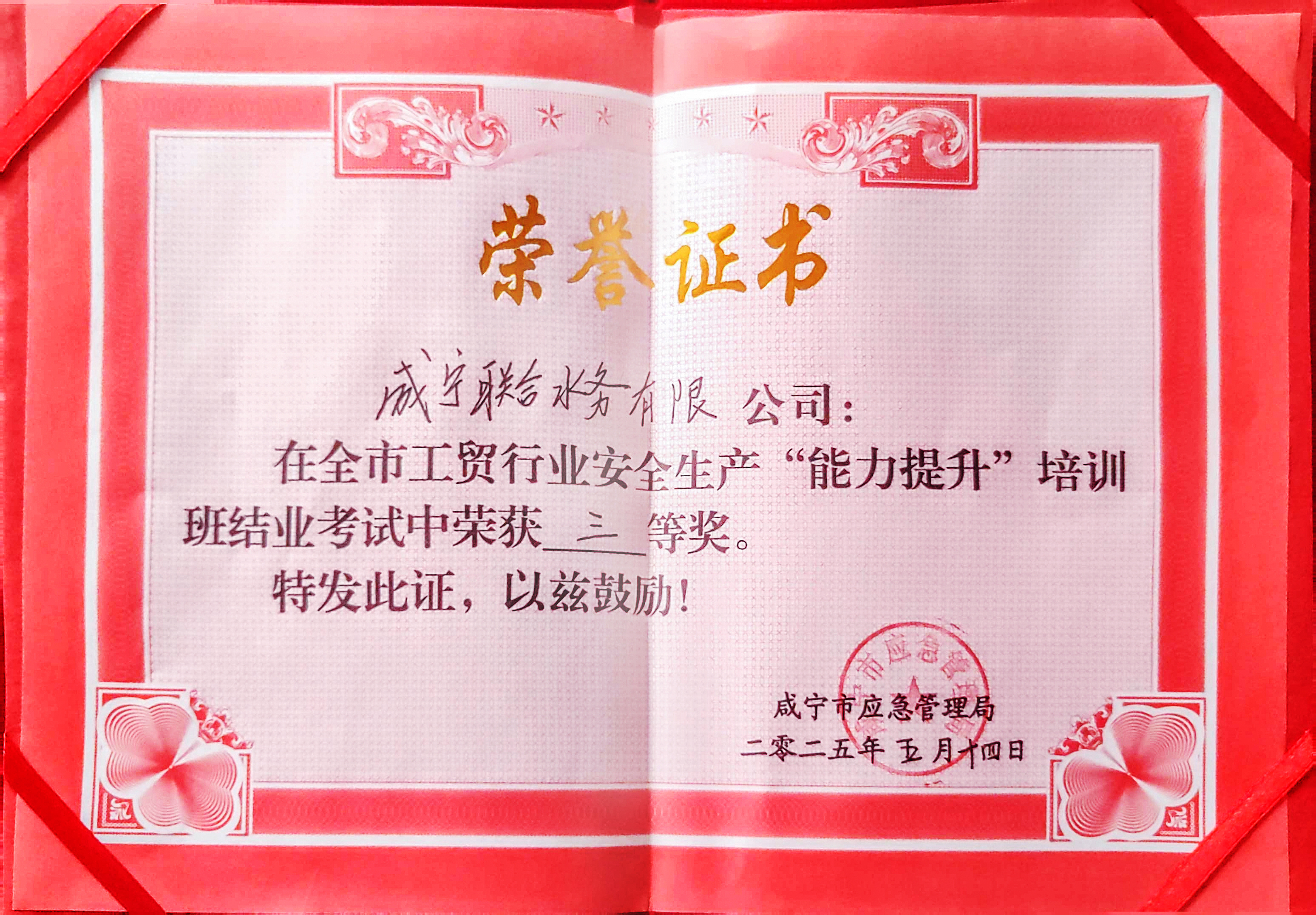 | 喜報|咸寧聯合水務員工榮獲咸寧市工貿行業安全生產“能力提升”培訓班結業考試三等獎 | ||