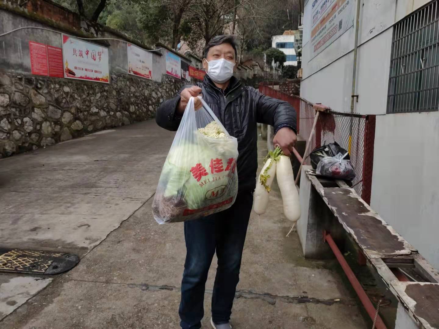 圖3:居民送來的愛心蔬菜 共戰疫情,共守平安。志愿者樊帆和祝恒哲是來自咸寧聯合水務公司兩名九零后小伙,值守在清馨苑小區門口,從早晨七點到晚上八點,兩位小伙一刻不停,嚴格詢問每一位出入人員,登記個人身份信息,詢問每一輛出入車輛,登記車輛信息及駕駛員個人身份信息,進行體溫測量……其中,志愿者樊帆是該小區居民,從值守之日起,他便開啟了“鐵面無私”的工作模式,無論是小區內關系較好的朋友或是鄰居,凡是不符合外出規定的,統統在他那吃了閉門羹.