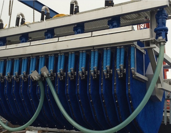 當水流經濾布進入過濾段時,水中的懸浮物被除去,固體留在濾布上。過濾后的水通過中央軸、上升豎井和溢流堰流出裝置。隨著固體顆粒在濾布上的堆積,過濾單元上的液壓阻力增大,從而使濾槽內的水位升高。