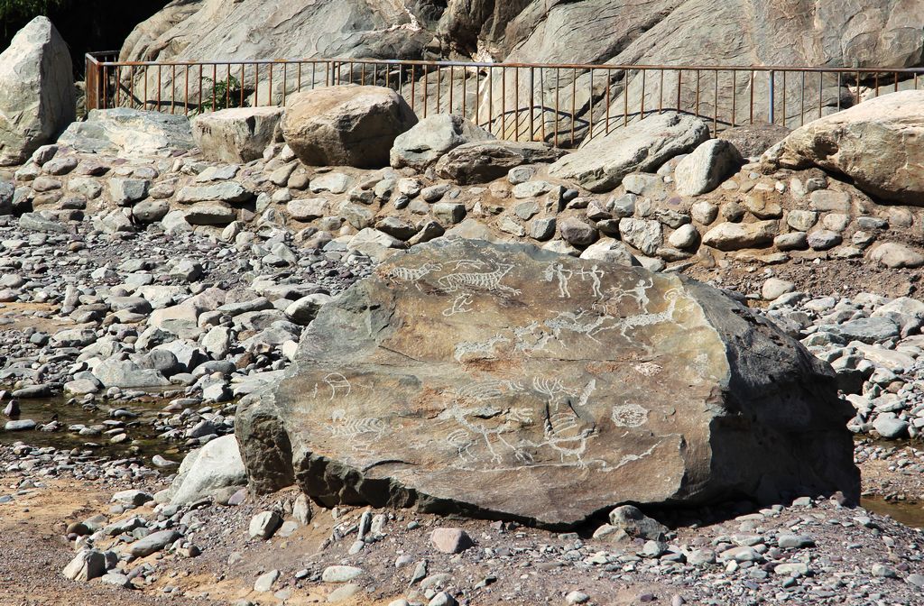 賀蘭也曾經是匈奴、鮮卑、突厥、回鶻、吐蕃、黨項等北方少數民族駐牧游獵、生息繁衍的地方。他們把生產生活的場景,鑿刻在賀蘭山的巖石上,來表現對美好生活的向往與追求,再現了他們當時的審美觀、社會習俗和生活情趣。在南北長200多公里的賀蘭山腹地,就有20多處遺存巖畫。其中最具有代表性的是賀蘭口巖畫。賀蘭口距銀川城50余公里,位于賀蘭山中段的賀蘭縣金山鄉境內,山勢高峻,海拔1448米,俗稱“豁了口”。山口景色幽雅,奇峰疊障,潺潺泉水從溝內流出,約有千余幅個體圖形的巖畫分布在溝谷兩側綿延600多米的山巖石壁上。畫面藝術造型粗獷渾厚,構圖樸實,姿態自然,寫實性較強。以人首像為主的占總數的一半以上。其次為牛、馬、驢、鹿、鳥、狼等動物圖形。人首像畫面簡單、奇異,有的人首長著犄角,有的插著羽毛,有的戴尖形或圓頂帽。表現女性的巖畫,有的戴著頭飾,有的挽著發髻,風姿秀逸,再現了幾千年前古代婦女對美的追求。有的大耳高鼻滿臉生毛,有的口銜骨頭,有的面部有條形紋或弧形紋。動物圖形構圖粗獷,形象生動,栩栩如生。有奔跑的鹿,有雙角突出的巖羊,有飛馳的駿馬,有搖尾巴的狗,有飛鳥的圖形和猛獸的形象,有部分人的手和太陽的畫面,還有原始宗教活動的場面。