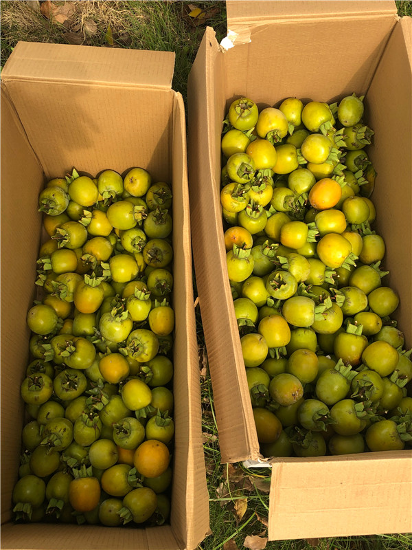 在鄭總的一聲令下,今年的“摘柿節”正式拉開序幕。也許是中午加餐了的原因,大家都是干勁十足。一開始都是踮起腳尖圍著被柿子壓彎的樹枝摘,很快踮起腳尖能夠得著的柿子都被摘干凈了,但馬上就有人找來了兩張椅子墊著摘。一個人摘,一個人抱著紙箱接著,生怕碰壞了一丁點兒,配合得極其融洽。沒過一會兒,墊著的椅子也不夠高了,這個時候就需要一兩名“勇士”了。張廠長和童哥自靠奮勇爬到樹上,瘋狂地收割著今年的“成果”。樹下的人也沒閑著,舉起長長的網兜接著剛摘下來圓鼓鼓的柿子。采摘進行得非常順利,陽光下,大家一個個都笑得合不攏嘴。有人上樹,就有人接著柿子,有人爬梯子就有人扶,有柿子掉地上,立馬就有人去撿。一個多小時的時間,竟然摘了整整五大箱。柿子樹下一片祥和的畫面,不身在其中很難體會到這種美好!