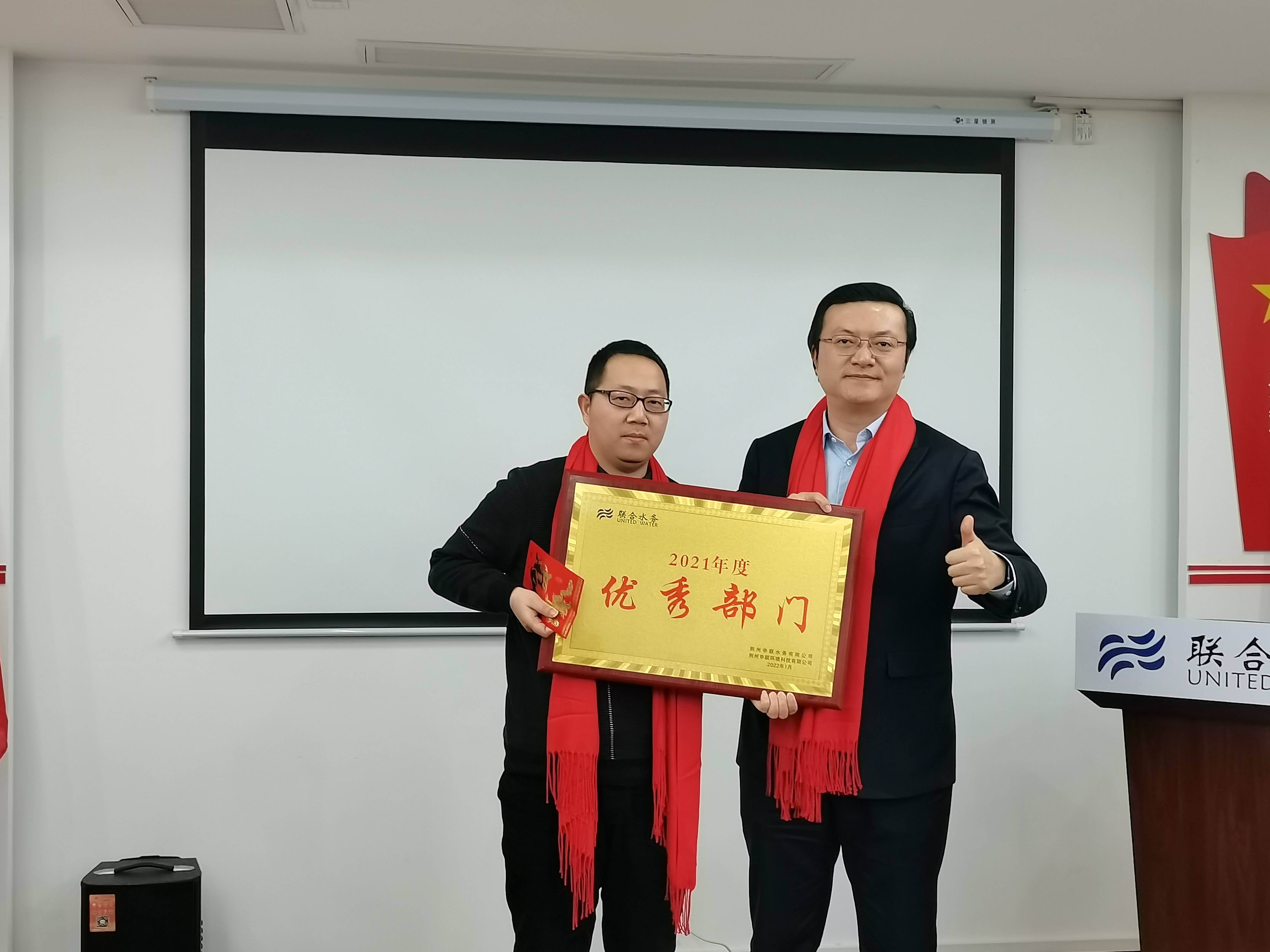 圖:聯合水務常務副總裁劉猛為優秀部門頒獎 會議最后,江蘇聯合水務科技股份有限公司常務副總裁劉猛作重要講話。首先,劉總代表總部對荊州公司2021年取得的驕人業績表示祝賀,對荊州公司全體員工所付出的努力表示衷心的感謝。隨后,劉總用三點感受綜合表述荊州公司取得的成績、面臨的挑戰以及發展的方向。一是擁抱變化,荊州公司全體員工以更加積極飽滿的熱情擁抱變化,以更加敬業的精神對待工作,加上管理團隊更加規范、精細的管理,才取得了優異的成績;二是挑戰自我,雖然面臨設備老舊、出水達標、業務拓展、新的業績考核指標等多重挑戰,但荊州公司各部門團結一心,求大同存小異,朝著完成下達的目標不懈努力;三是創造價值,一方面在提標升級改造項目竣工前,在產能、工藝雙受限的基礎上,盡量接納更多的污水,為荊州市節能降碳貢獻力量,為社會創造價值;另一方面,以“我不負公司,公司定不負我”的積極心態繼續開源節流,努力打破污水處理廠圍墻邊界所帶來的限制,全方位拓展新業務,勇于開拓、勇于創新,為公司創造價值。最后,劉總希望大家在虎年虎虎生風,為荊州公司、為聯合水務創造更多的價值、創造更好的業績。